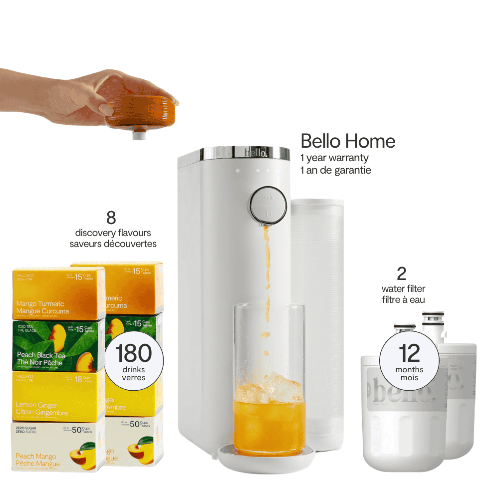 Bello filters your tap water and lets you create any type of non-carbonated drink, from 0-calorie flavored waters to functional wellness drinks like lemon-ginger, using our Bello capsules.